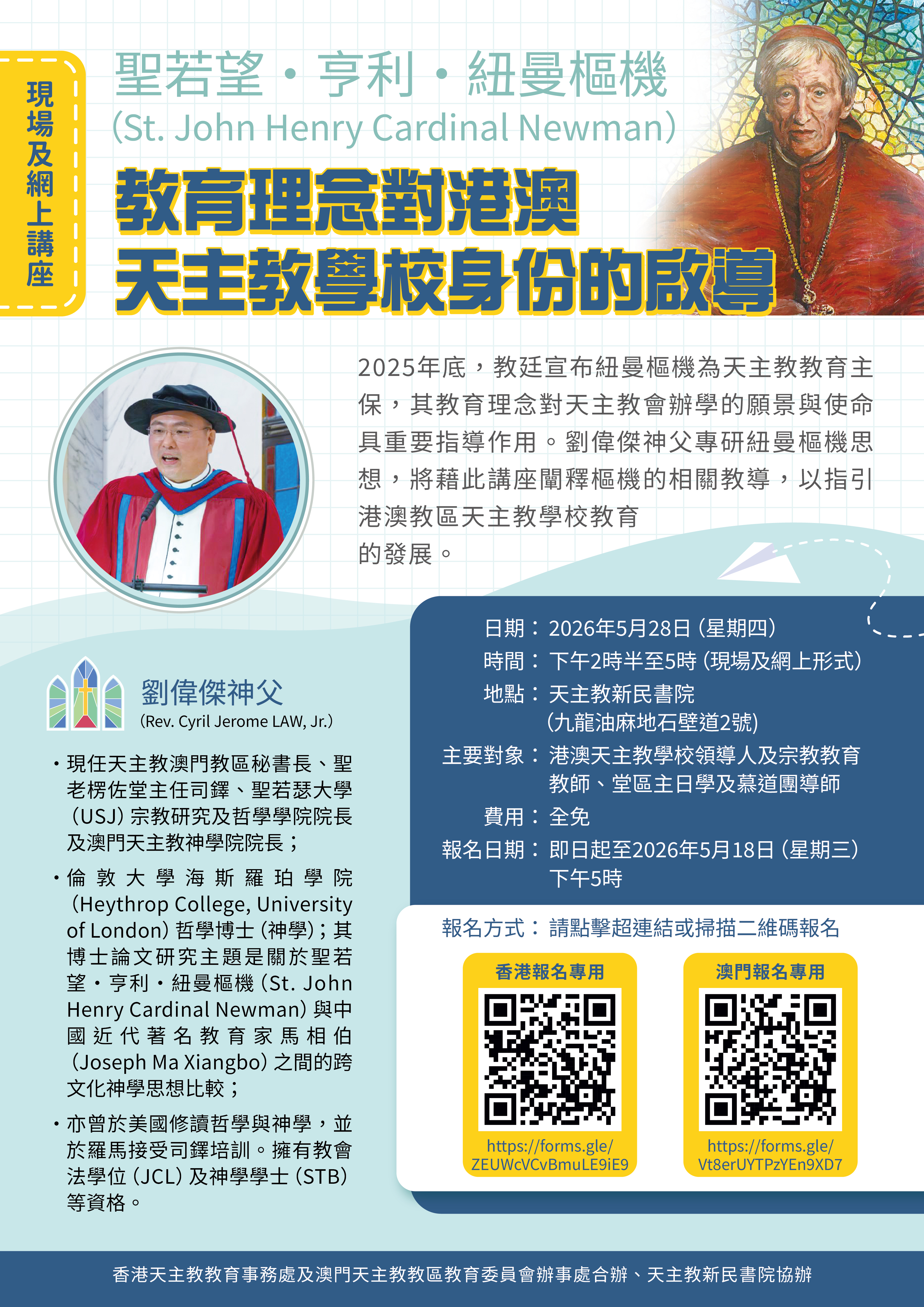 2025年底,教廷宣布聖若望・亨利・紐曼樞機為天主教教育主保,其教育理念對天主教會辦學的願景與使命具重要指導作用。現服務於澳門教區的劉偉傑神父專研紐曼樞機思想,將藉此講座闡釋樞機的相關教導,以指引港澳教區天主教學校教育的發展。